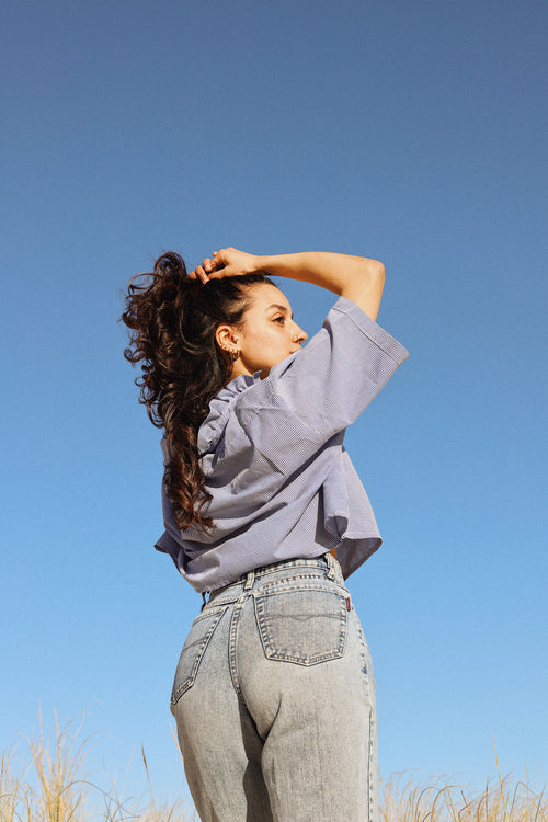 Chemise col volant Vichy bleu et blanc – Pièce unique